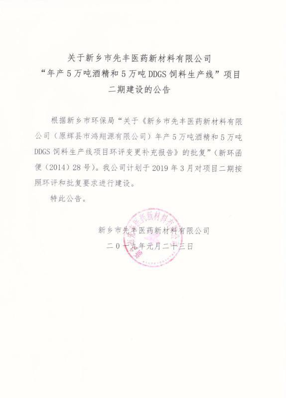 關(guān)于新鄉(xiāng)市先豐醫(yī)藥新材料有限公司“年產(chǎn)5萬噸酒精和5萬噸DDGS飼料生產(chǎn)線”項(xiàng)目二期建設(shè)公告
